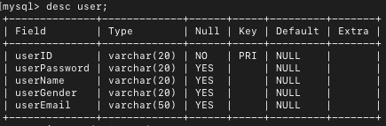 데이터베이스는 Mysql을 사용한다. 아래와 같이 데이터베이스 테이블을 생성한다.