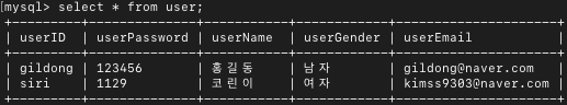 페이지에서 회원가입을 진행하고 mysql에 저장되는 것을 확인하였다.