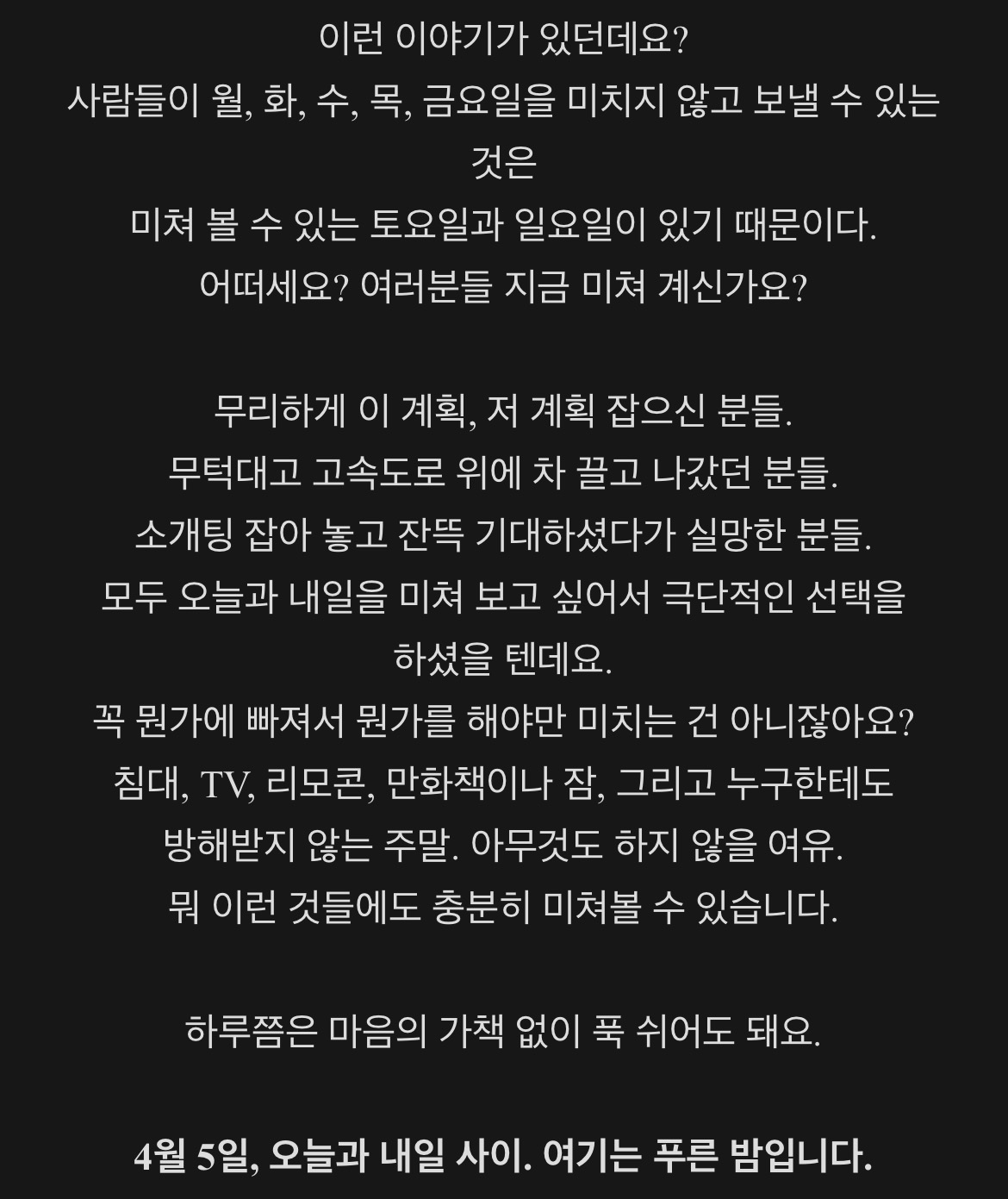 마지막 사진은 웹서핑을 하다가 발견했는데 그냥 글이 와 닿아서 저장했다. "오늘과 내일 사이"라는 말이 눈에 확 들어오는 날이다.