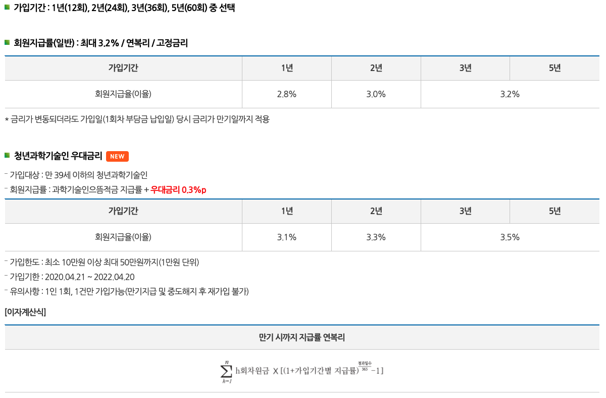 금리는 기본 상품은 2.8~3.2%이고 청년과학기술인 우대금리는 3.1~3.5% 복리입니다. 요즘같은 저금리 시대에 찾아볼 수 없는 상품입니다. 최대 50만원까지 가능하니 50만원씩 3년을 채우면 원금 18,000,000원 + 세후이자 850,344원으로 18,850,344원을 받을 수 있습니다.