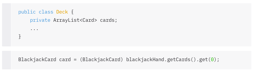카드 정렬 Collections 클래스와 Comparable 인터페이스를 이용해 Card 리스트를 작은 순서로 정렬해봅시다. 룰은 다음과 같습니다: 슈트(suitNumber)가 높은 카드가 '더 크다'. 수트가 같은 경우, 랭크(rankNumber)가 더 높은 카드가 '더 크다'. package Ex0309; public class Card implements Comparable { public final int suitNumber; public final int rankNumber; public Card(int suitNumber, int rankNumber) { this.suitNumber = suitNumber; this.rankNumber = rankNumber; } public String ge..